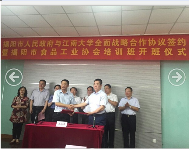 本次學習交流培訓得到市委市政府的高度重視,在開班儀式上,揭陽市副市長曾瑞如致辭并作開班動員講話,江南大學食品學院陳衛院長與揭陽市藍城區管委會、揭陽市產業轉移工業園主任蔡淡群簽約全面戰略合作協議和成立國家級食品研究中心協議。揭陽市食品藥品監督管理局局長黃偉忠對揭陽市食品工業情況作了全面的介紹。